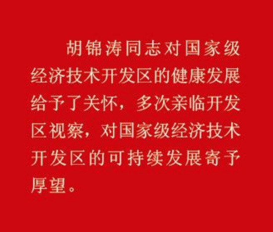 胡锦涛同志对国家级经济技术开发区的健康发展给予了关怀,多次亲临开发区视察,对国家级经济技术开发区的可持续发展寄予厚望。