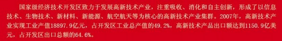 国家级经济技术开发区致力于发展高新技术产业,注重吸收、消化和自主创新,形成了以信息技术、生物技术、新材料、新能源、航空航天等为核心的高新技术产业集群。2007年,高新技术产业实现工业产值18897.9亿元,占开发区工业总产值的49.2%,高新技术产品出口额达到1150.9亿美元,占开发区出口总额的64.6%。