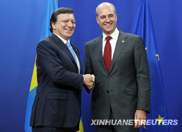 9月17日,在比利时首都布鲁塞尔的欧盟总部,欧盟轮值主席国瑞典首相赖因费尔特(右)欢迎欧盟委员会主席巴罗佐参加欧盟非正式峰会。当天,欧盟举行非正式峰会,为下周在美国匹兹堡举行的二十国集团峰会就国际金融改革、为遏制气候变化筹资以及是否继续刺激经济等问题协调立场。 新华社/路透