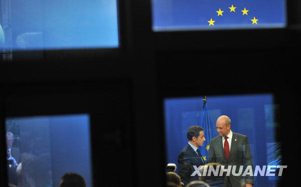 9月17日,在比利时首都布鲁塞尔,欧盟轮值主席国瑞典首相赖因费尔特(右)迎接抵达欧盟总部参加欧盟非正式峰会的法国总统萨科齐。当天,欧盟举行非正式峰会,为下周在美国匹兹堡举行的二十国集团峰会就国际金融改革、为遏制气候变化筹资以及是否继续刺激经济等问题协调立场。 新华社记者武巍摄