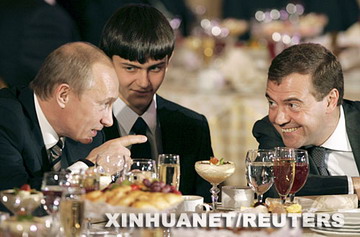 12月24日,俄罗斯总统普京(左)和第一副总理梅德韦杰夫(右)在首都莫斯科克里姆林宫举行的“家庭年”开幕式上交谈。普京本月10日表示,支持梅德韦杰夫竞选下届总统。新华社/路透