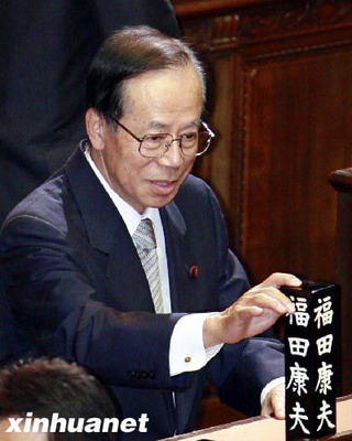 2007年9月25日,在日本首都东京,日本自民党新总裁福田康夫在国会众议院的投票现场。日本国会众议院全体会议当天下午举行首相指名选举。在476张有效选票中,福田康夫以过半数的338票当选新首相。新华社记者任正来摄