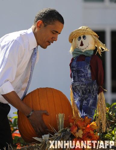 10月30日,在美国佛罗里达州的萨拉索塔,选战中四处奔走的美国民主党总统候选人奥巴马忙里偷闲,来到当地的一家南瓜园摘南瓜,享受片刻悠闲。 新华社/法新
