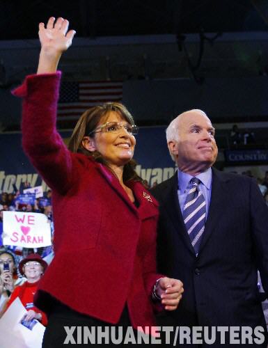 10月28日,佩林(左)与麦凯恩在美国宾夕法尼亚州的赫希参加总统竞选活动时向支持者挥手。 新华社/路透