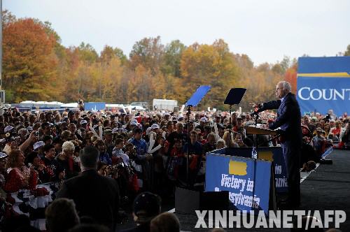 11月1日,美国共和党总统候选人约翰·麦凯恩在宾夕法尼亚州珀卡西的竞选集会上讲话。美国四年一度的总统选举将于11月4日举行。 新华社/法新