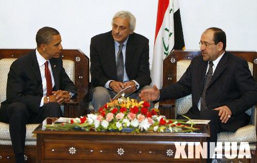 7月21日,伊拉克总理马利基(右)在巴格达会见到访的美国民主党总统竞选人奥巴马。当天,奥巴马抵达伊拉克,开始他参选总统以来对伊拉克的第一次访问。访问伊拉克期间,他将同伊拉克领导人和驻伊美军高级指挥官举行会晤。 新华社/路透