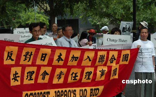 资料图:当地时间2005年六月三十日中午,在纽约联合国总部附近的哈玛绍广场,“世界抗日战争史实维护联合会”举行示威,反对日本加入安理会常任理事国。 中新社发 谭宏伟 摄