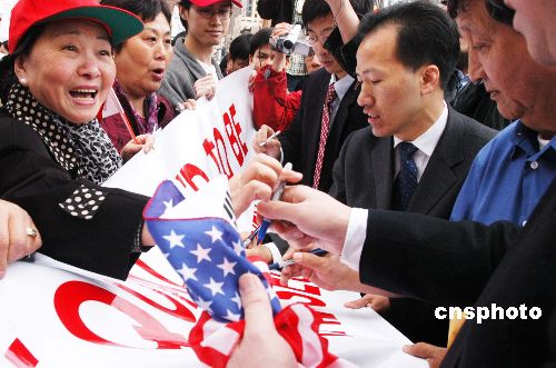 当地时间2005年四月二十二日,美东学界侨界在纽约联合国总部前广场举行和平示威,抗议日本争当联合国安理会常任理事国。图为示威者在反对日本“入常”的横幅上签名。 中新社发 龚文谟 摄
