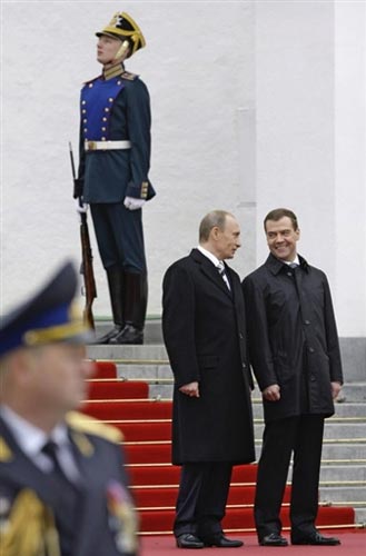 梅德韦杰夫与普京并肩而立